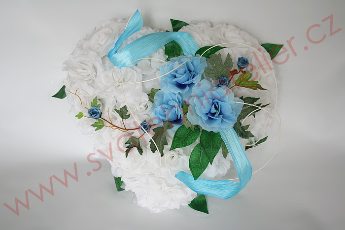 Velká a výrazná dekorace svatebního vozu. Dekorace je bohatě posázená bílými růžemi a doplněna dalšími modrými růžemi a květy, zelenými lístky a mašlí. Dekorace je na polystyrenové základně a na auto se upevňuje nalepením. Lepící páska je již přímo na dekoraci. Velikost cca 0,5 x 0,5m. Základ s bílými růžemi je vždy stejný, aranžmá modrých doplňků a ostatních dekorací dle dodávky výrobce. Nelze vždy zajistit totožné uspořádání jako na fotografii. Prosím prohlédněte si také ostatní barevné verze pro představu možného uspořádání barevných dodatků.