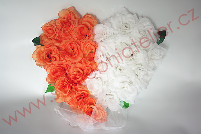 Velká a výrazná dekorace svatebního vozu. Polovina dekorace je bohatě posázená bílými růžemi, druhá půle lososovými růžemi. Dále je doplněna zelenými lístky a tylovou mašlí s perličkami. Dekorace je na polystyrenové základně a na auto se upevňuje nalepením. Lepící páska je již přímo na dekoraci. Velikost cca 0,5 x 0,5m.