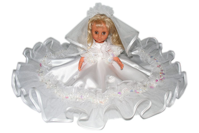 Panenka na auto s blonďatými nebo hnědými vlásky v bílých saténových šatičkách. Sukně je zdobena saténovými růžičkami, je ukončena výrazným tylovým volánem a lemovaným saténovou paspulkou. Volán je dále dekorovaný ozdobným prýmkem s řadou flitrů, které podle světla mění svoji barvu. Stejná dekorace se nachází na rukávcích šatiček. Kolem krku má panenka perličky a na hlavě závoj lemovaný saténovou paspulkou. Bohatost šatiček je docílena tylovou spodničkou. Panenka má na zadečku a na nožičkách přísavky pro upevnění na kapotu vozu. Variantu vlásků vyberte prosím šipkou nad obrázkem. Výška panenky je 30 cm, průměr sukně cca 65cm. Šatičky pro panenky vyrobily zaměstnankyně chráněné dílny. Upozornění: Z důvodů rozdílných dodávek panenek od dodavatele nemusí obličej panenky vypadat stejně jako na fotografii. Dodržujeme pouze barvu vlásků a typ šatiček dle obrázku.