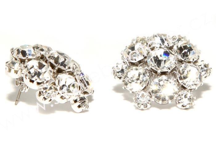 Masivní štrasové náušnice z broušených kamenů různých velikostí. Průměr cca 2,5 cm, puzeta. Rhodiová galvanizace.